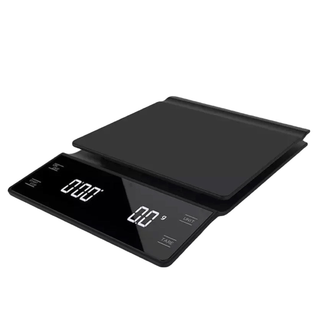 Enkel og elegant kaffevekt med timer og alle funksjoner man trenger. Det følger med en matte i silikon for å kunne veie nøyaktig selv med varm kaffe på veieplaten. Drives på standard AAA batterier x3 (følger ikke med).